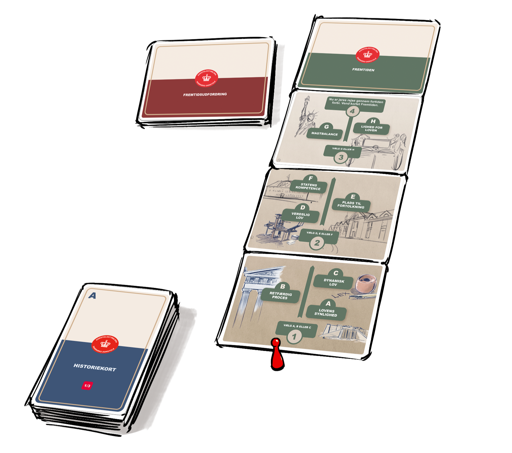 I Med Lov Skal Land Bygges tager spillerne på en rejse gennem historien, hvor de samler tre idéhistoriske principper op. Hvert princip ledsages af tre historiekort, som viser, hvilken udfordring princippet løste, hvilke fremskridt det førte til, og hvordan det kommer til udtryk i dag. Ved rejsens afslutning bruger spillerne principperne til at reflektere over en af fremtidens udfordringer for retsstaten.